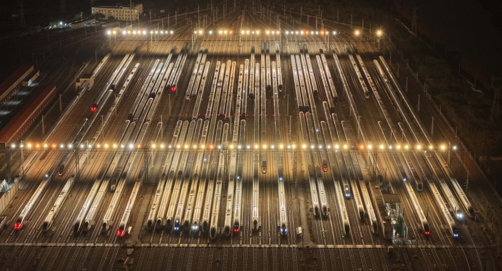 2026年2月1日,动车组列车停靠在广州动车段存车场(无人机照片)。新华社记者 邓华 摄