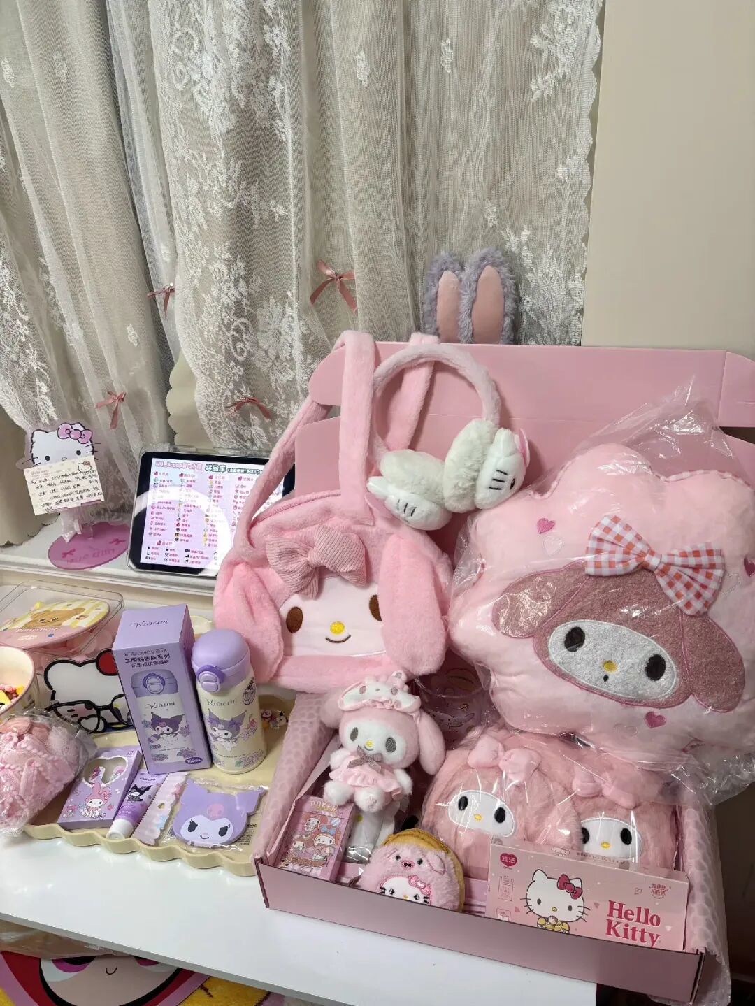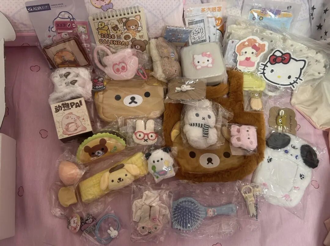 洛西则是Hello Kitty的爱好者。过年那会儿,她在一家盲勺店里下单,虽然每勺要168元,她还是买了两勺,收到了Hello Kitty的杯子、收纳包、毛绒挂件等,送的3个扭蛋中,有一个还扭到了一件印有粉色小熊的毛衣。